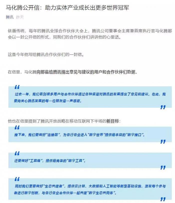 马化腾在信中提及腾讯开放战略在移动互联网下半场的新目标:做好“连接器”,为各行各业进入“数字世界”提供最丰富的“数字接口”;做好“工具箱”,提供最完备的“数字工具”;做好“生态共建者”,提供云计算、大数据和人工智能等新型基础设施,激发每个参与者进行数字创新,与各行各业合作伙伴一起共建“数字生态共同体”。