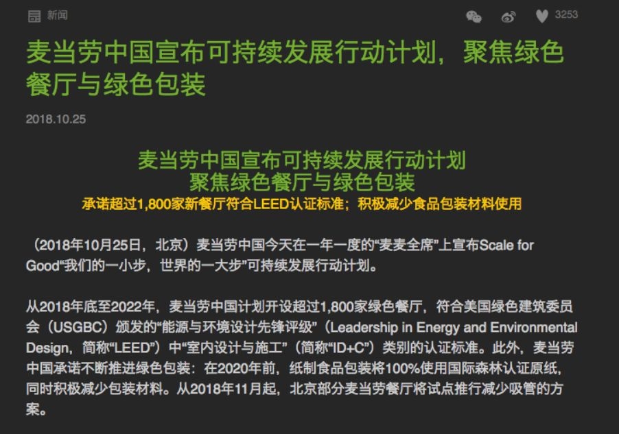 麦当劳中国日前在京还宣布,从今年年底到2022年,公司计划开设超过1800家绿色餐厅,2020年前,麦当劳中国纸制食品包装将100%使用国际森林认证原纸,同时减少包装材料。本月起,北京部分麦当劳餐厅将试点推行减少吸管的方案。