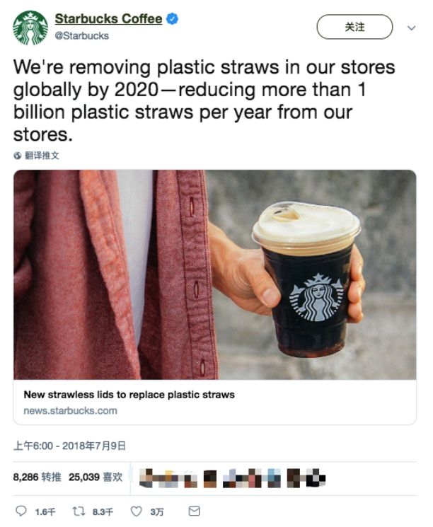 就像文章开头提到的一样,除了快餐巨头麦当劳外,星巴克在今年7月上旬也推出了类似的政策——将在两年内逐步淘汰塑料吸管,到2020年,全球超过28000家门店都将完全禁用!