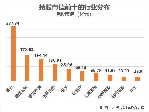 而从持股市值来看,银行占约27.4%的市值权重,其次为食品饮料、家用电器、医药生物等行业。