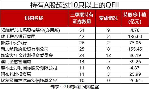 据21数据新闻实验室统计,截至三季度末,280只A股的前十大流通股东中出现了QFII的身影,总持股数达100.47亿股,持仓总市值达1380.11亿元。