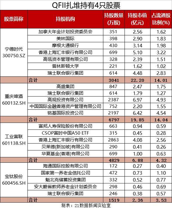 具体到个股,截至三季度末,多只A股被QFII扎堆持有,其中,宁德时代被7个QFII持有,工业富联、宝钛股份、重庆啤酒都有5个QFII持有;从持股比例来看,宁德时代和重庆啤酒的持股比率均逾14%。