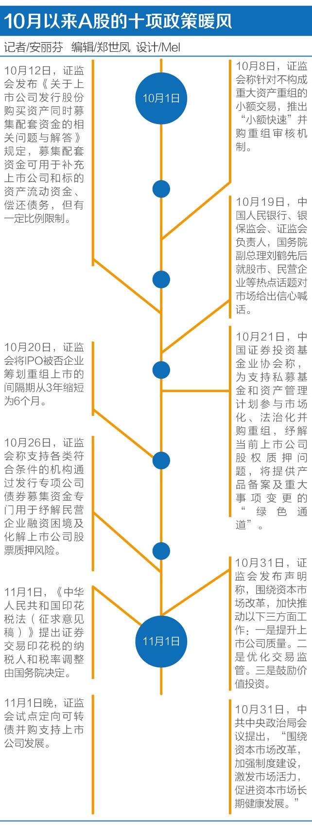 据21世纪经济报道记者粗略统计,国庆节后,多部委及相关部门通过各渠道支持A股的较大力度政策即超过10项,包括印花税调整权转给国务院相机决定、鼓励并购重组、支持机构发行公司债券用于纾解民企融资困境及化解上市公司股票质押风险、修改《公司法》中回购规定等。