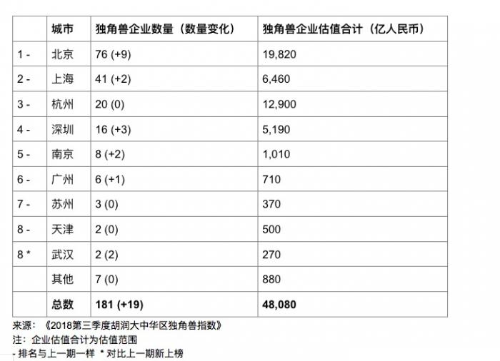 《指数》显示,第三季度中国每2.6天就会产生一家新的独角兽企业,总数上升至181家。整体估值超过4万亿元。