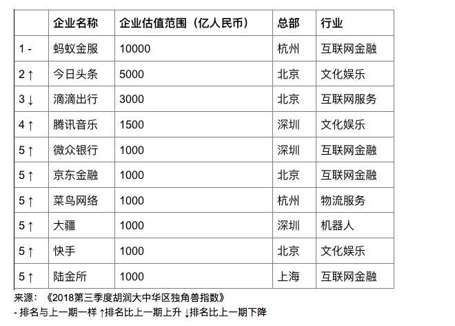11月2日,胡润研究院发布《2018第三季度胡润大中华区独角兽指数》(下称《指数》),统计数据截止到2018年9月30日。