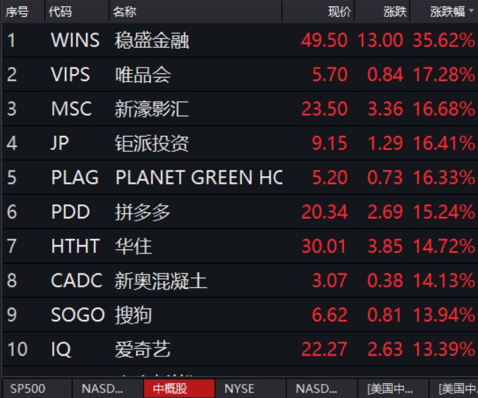 拼多多涨15.24%,搜狗涨13.94%,爱奇艺涨13.39%,虎牙直播涨12.99%,微博涨12.27%,蔚来汽车涨12.03%;另有宜人贷、趣店、优信、趣头条等个股涨超10%。