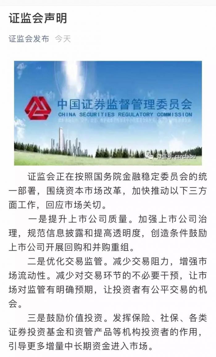 10月30日上午,证监会发布声明,表示正在按照国务院金融发展稳定委员会的统一部署,围绕资本市场改革,加快推动三方面工作,回应市场关切。