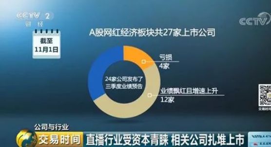 近两年,“电商+直播”已经从一个新玩法,慢慢发展为电商的新常态,“电商+直播”也成为越来越多年轻人的创业之路。 网红经济火了,不仅仅是相关上下游产业得到了发展,直播主播的变现方式也开始多元化起来,主播的收入也随着更加多了起来。 不仅如此,网红经济的火热,也掀起了一股IPO浪潮。同时,上半年直播资本也较活跃,直播资本融资事件多达11起,涉及金额超百亿。更令人惊讶的是,截至11月1日,A股网红经济板块共27家上市公司,有24家公司发布了三季度的业绩预告,其中发布亏损的只有4家,业绩飘红且增速上升的有12家。有公司净利润增长幅度超900%。
