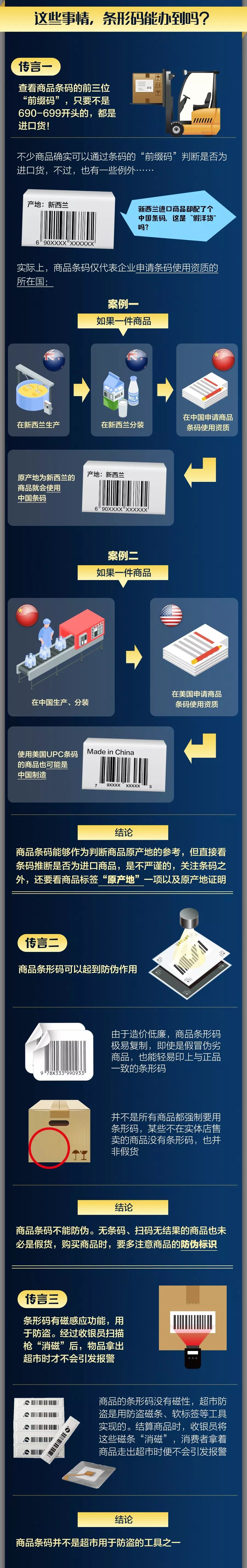 如果你经常购买进口商品,可能还听过这些传言:如果商品条形码的开头数字是“69”,那么该商品就一定国产;若是原产地位于国外的商品,条码以“69”开头,那就证明买到了假“洋货”;用软件扫描条码,若没有结果,也可能是碰到了假货……这些说法,都是真的吗?