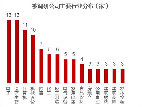 从行业分布来看,电子、医药生物、计算机、机械设备获调研公司数量最多。科技股再度成为集中调研的目标,卫宁健康、利亚德、洁美科技受关注。