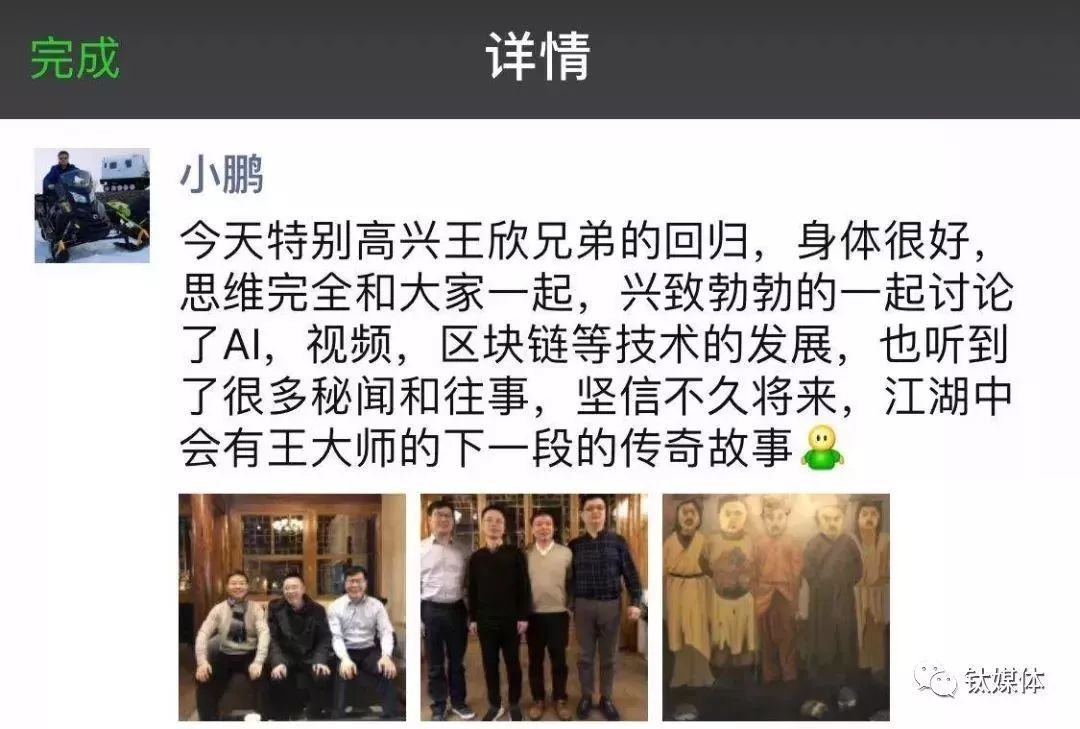 2018年2月7日晚间,出狱后王欣和何小鹏、姚劲波、李学凌重聚,公众从何小鹏的朋友圈看到王欣出狱的首次现身。那次回归,王欣与之讨论AI、视频、区块链等技术,似乎让王欣回到了中国火热的科技创业氛围中。