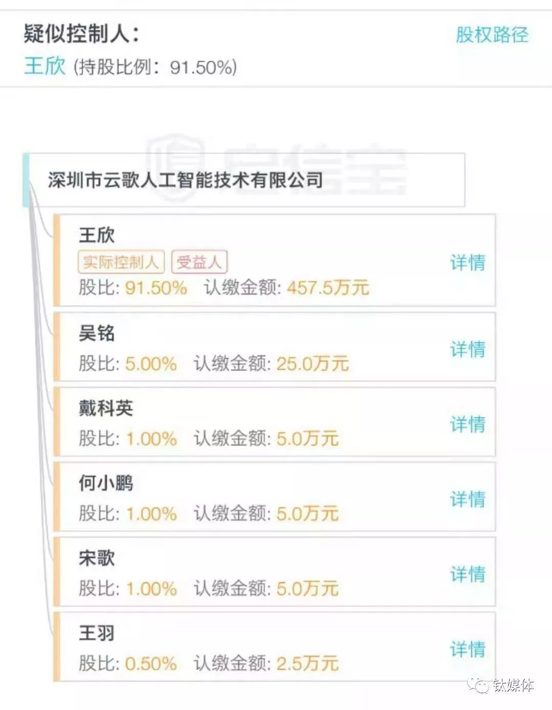 就在出狱后的第13天,王欣控股的深圳云歌人工智能技术有限公司成立,而公司的法人代表为妻子彭鹏。