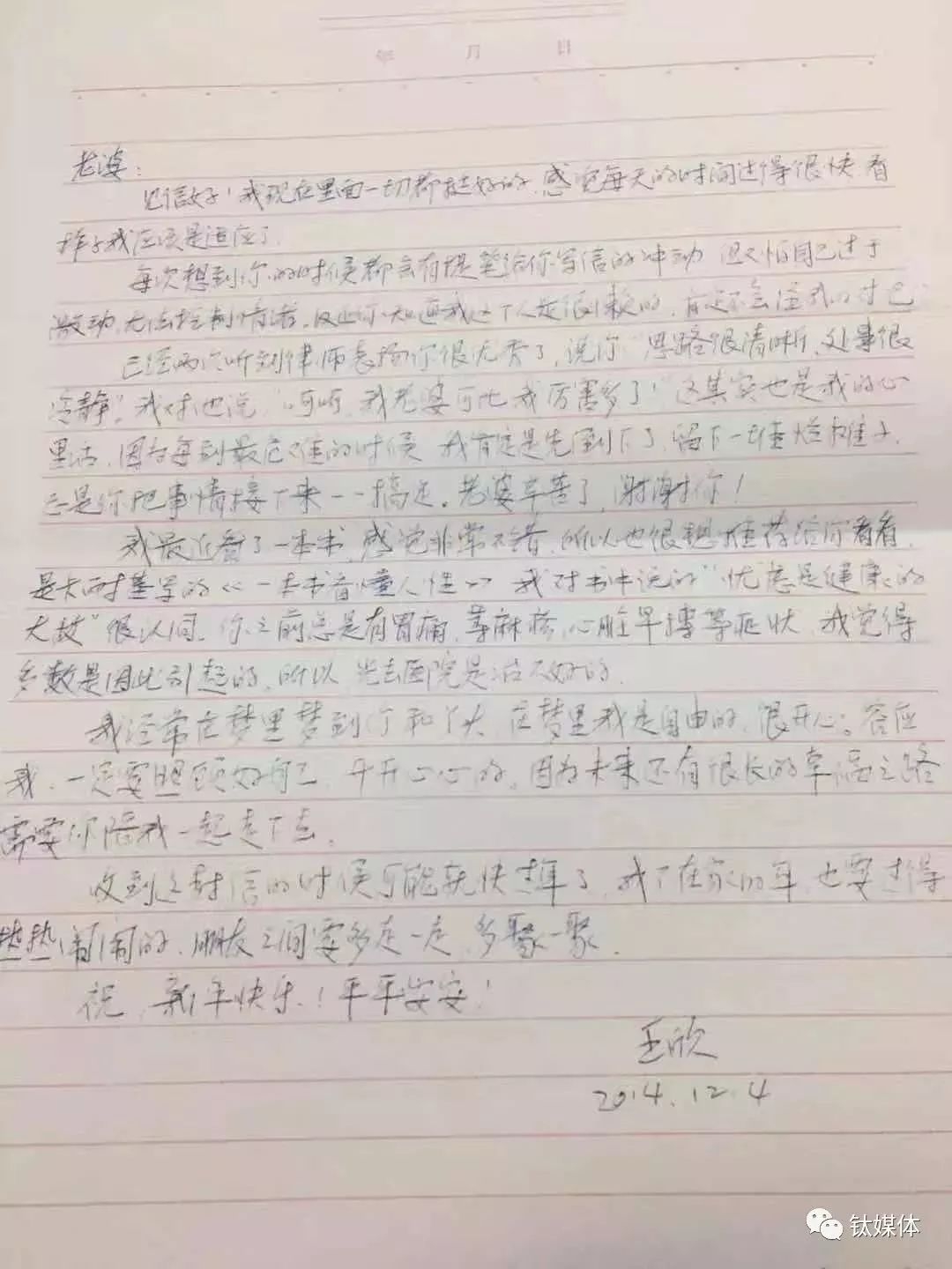 11月4日下午,微博署名为“快播王欣太太”(妻子彭鹏)通过微博公开了与狱中王欣沟通的部分信件。