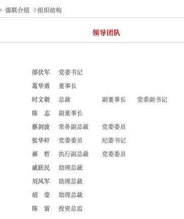 11月5日,21世纪经济报道记者查阅银联官网发现,银联高层人事出现变化。原央行办公厅主任邵伏军担任银联党委书记,葛华勇仍任董事长,时文朝不再担任党委书记,仍任总裁。