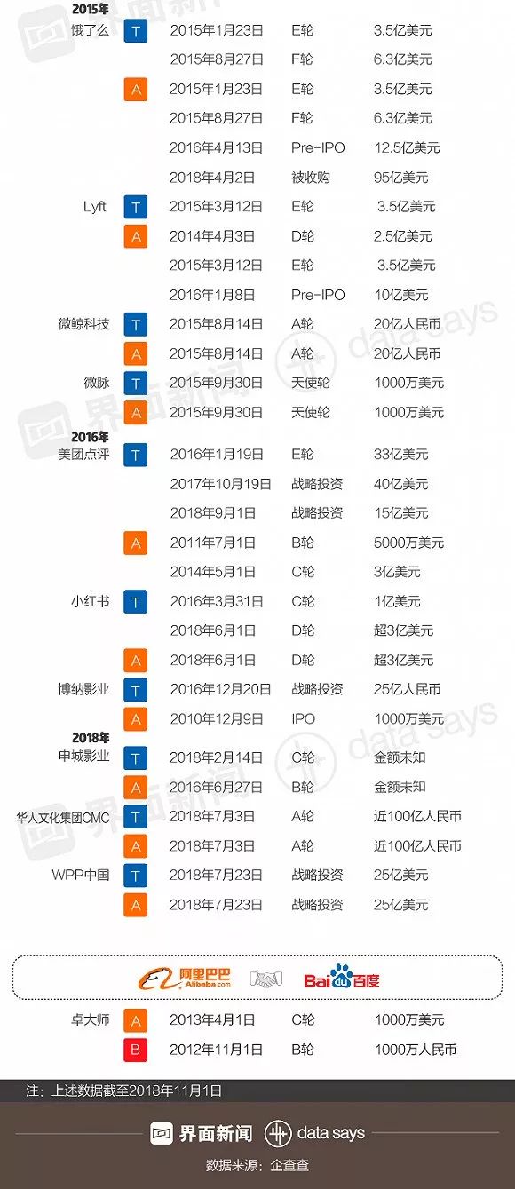 近年互联网巨头们的“投资战”方兴未艾。据企查查数据,截至2018年11月1日,中国联通是唯一获得三家互联网巨头共同投资的公司。自2008年起,启明信息、华扬联众等18家企业(项目)相继受到腾讯与百度的“青睐”,而在竞争最激烈的腾讯与阿里巴巴之间,也有滴滴出行、Snap等16家共同投资的企业。