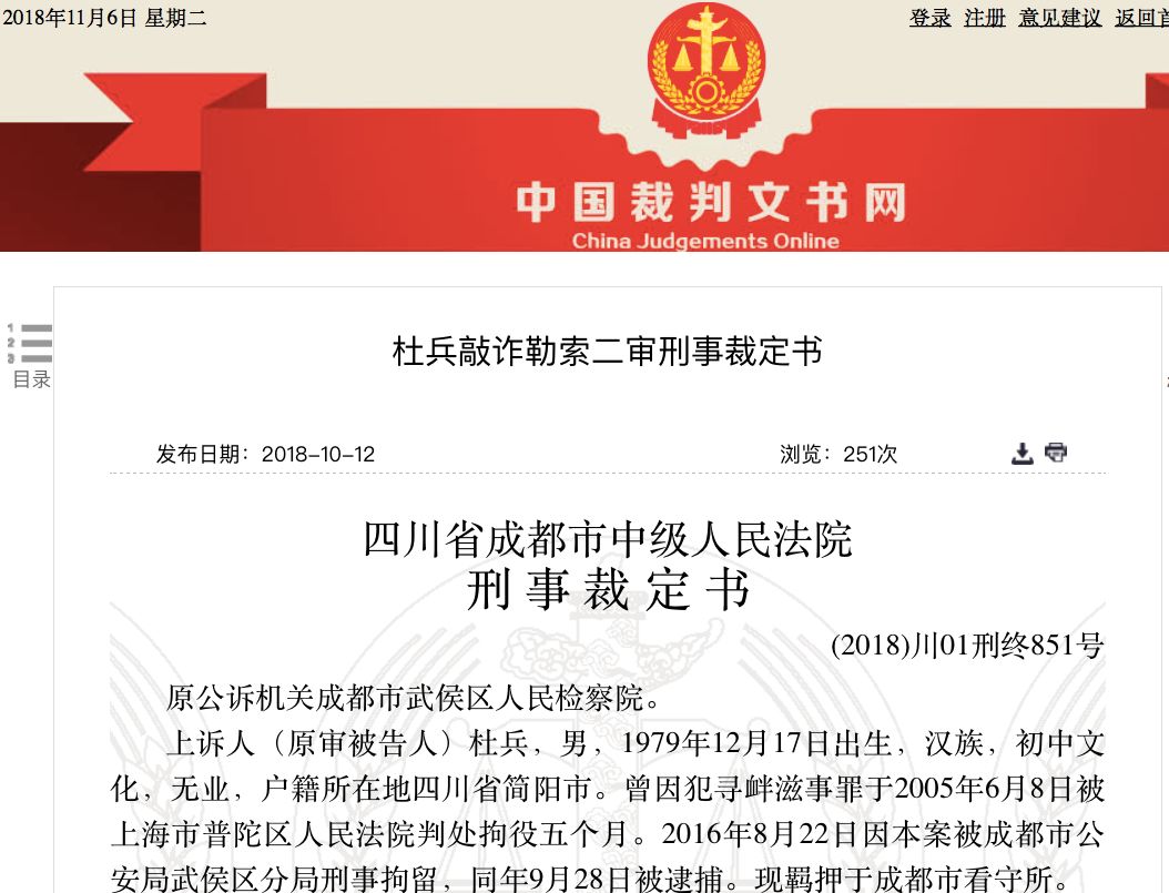 《刑事裁定书》显示,杜兵出生于1979年12月17日,初中文化。曾因犯寻衅滋事罪于2005年6月8日被上海市普陀区人民法院判处拘役五个月。2016年8月22日因本案被成都市公安局武侯区分局刑事拘留,同年9月28日被逮捕。