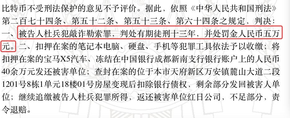 不过,四川省成都市中级人民法院认为,上诉人杜兵以非法占有为目的,非法获取红日公司敏感资料,迫使该公司使用人民币2999981.7元购买比特币2099.7个转移至其指定地址,其后将该比特币变卖提现得款200余万元,数额特别巨大,其行为已构成敲诈勒索罪。