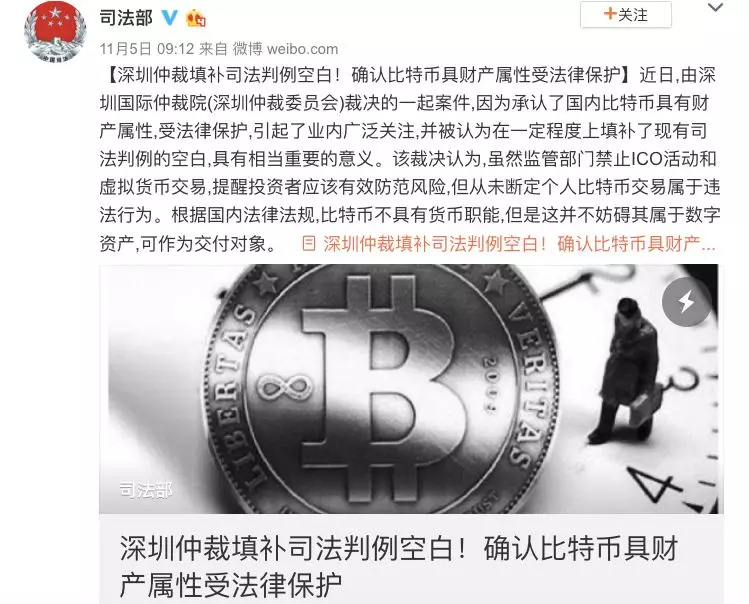 这让人联想到近日深圳国际仲裁院(深圳仲裁委员会)裁决的一起案件。据《法制日报》11月5日报道,这起案件的裁决承认了国内比特币具有财产属性,受法律保护。而这在一定程度上填补了现有司法判例的空白,具有相当重要的意义。
