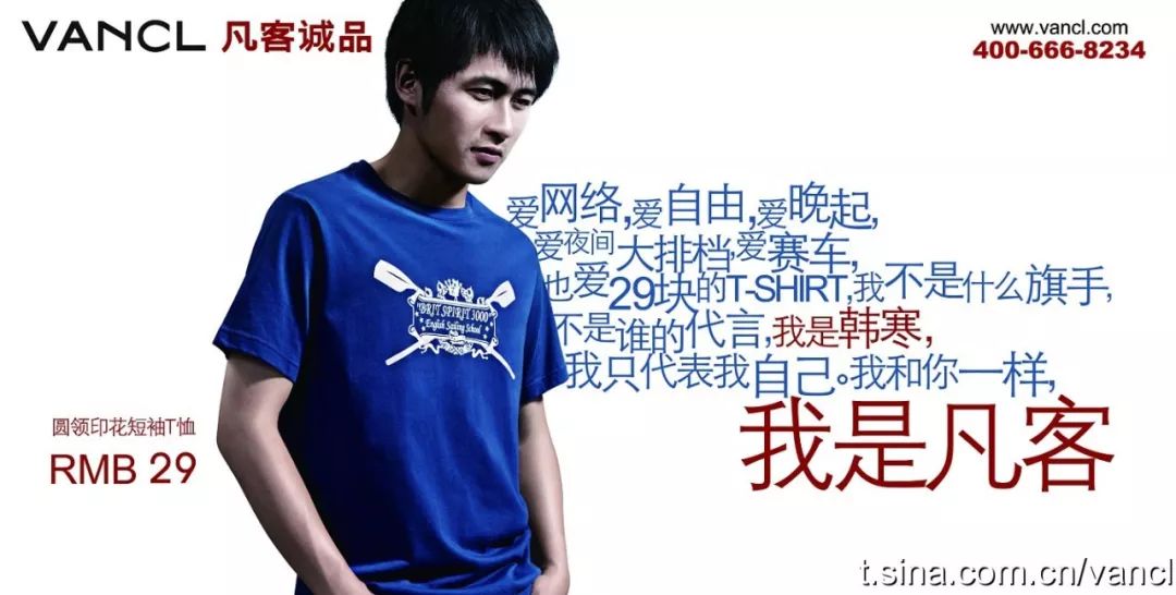“爱网络,爱自由,爱晚起,爱夜间大排档,爱赛车,也爱29块的T-SHIRT,我不是什么旗手,不是谁的代言,我是韩寒,我只代表我自己。我和你一样,我是凡客。”2010年7月,韩寒代言的这句广告词红极一时,坚持自有服装品牌网上销售的凡客走上巅峰。