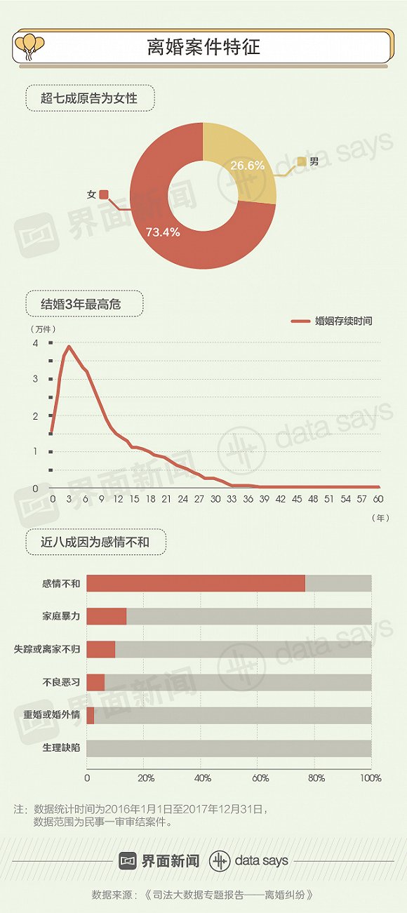 中国最高人民法院数据显示,超七成离婚案件的原告都是女性,婚后第三年的离婚几率最高。