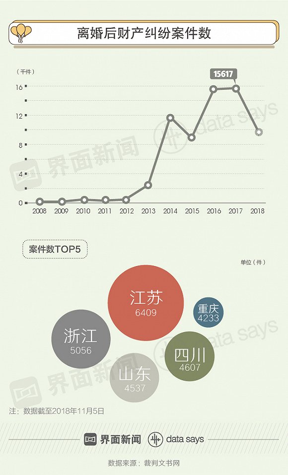 裁判文书网数据显示,有关“离婚后财产纠纷”的案件在近年不断增多,尤其在2017年,案件数达到1.56万件,创下新高。
