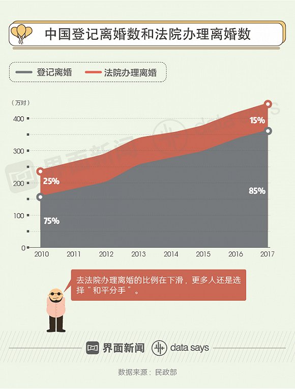 虽说离婚本身不是件“体面”的事,但中国人处理这件事的方式越来越“体面”:去法院办理离婚的比例从2010年的25%降至2017年的15%,也就是说,越来越多的夫妻选择“和平分手”。