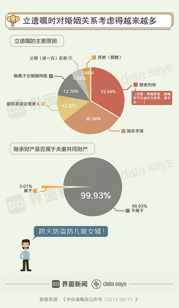 《中华遗嘱库白皮书(2013-2017)》显示,有99.93%的老年人在立遗嘱时选择了“防儿媳女婿”条款,规定继承人所继承的财产属于个人财产,不属于其夫妻共同财产。