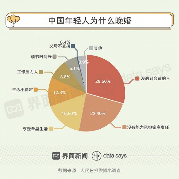人民日报曾在今年10月做了一个晚婚原因小调查,“没有遇到合适的人”、“没有能力承担家庭责任”和“享受单身生活”成为最主要的晚婚原因。