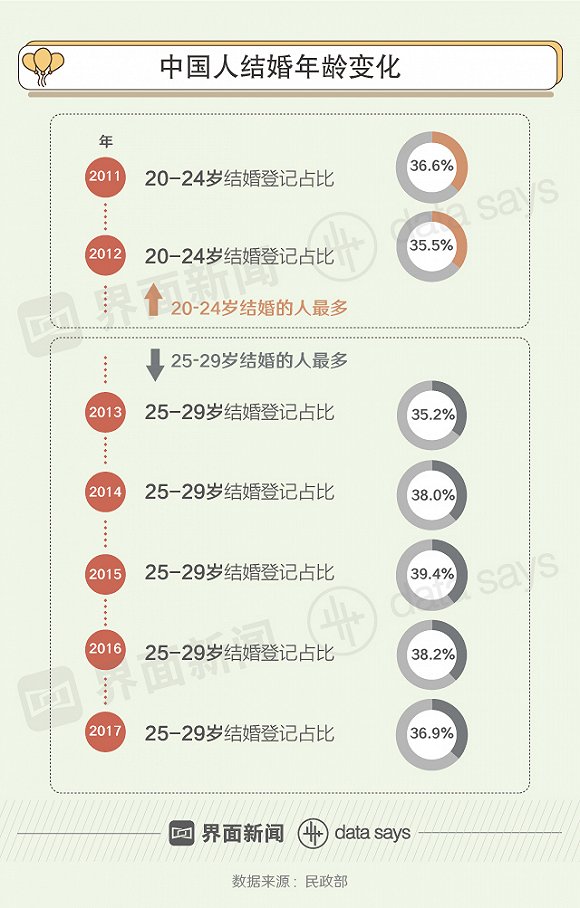 并且,中国人的晚婚现象也越来越普遍。2013年之前,20-24岁的人最多;2013年之后,25-29岁结婚的人占多数。