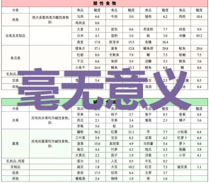 至于网络上类似下面这种,煞有介事整理出的酸碱食物表,真的是……毫无意义!