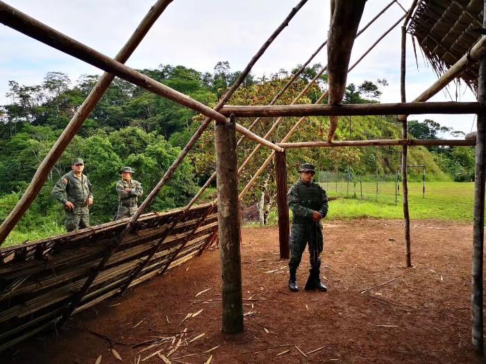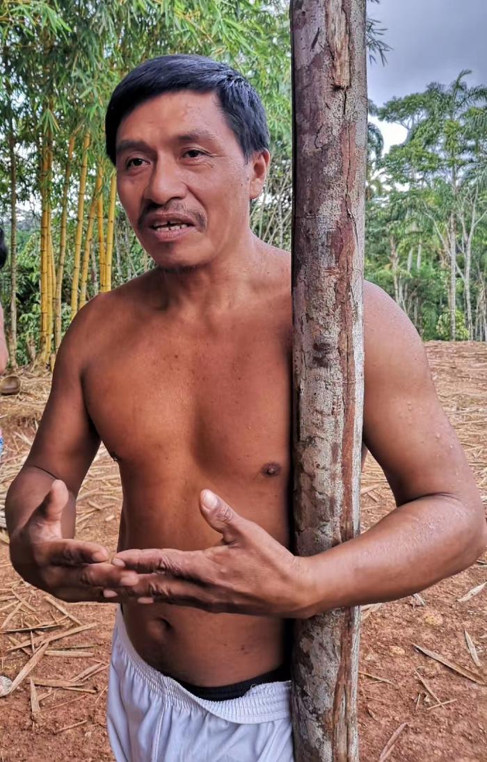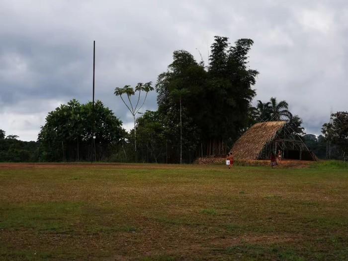 今天访问了距离南区油田营地不足5、6公里的印第安Wuaorani原始部落。Davo Enomenga是部落酋长,远近闻名。他家前面有一大片空地,为了向下一代传授印第安人原始部落的房屋建筑技术,人们正在搭建一座印第安人传统茅草屋。访问就在这间未建成的茅草屋里进行。