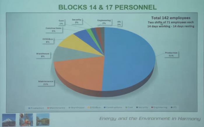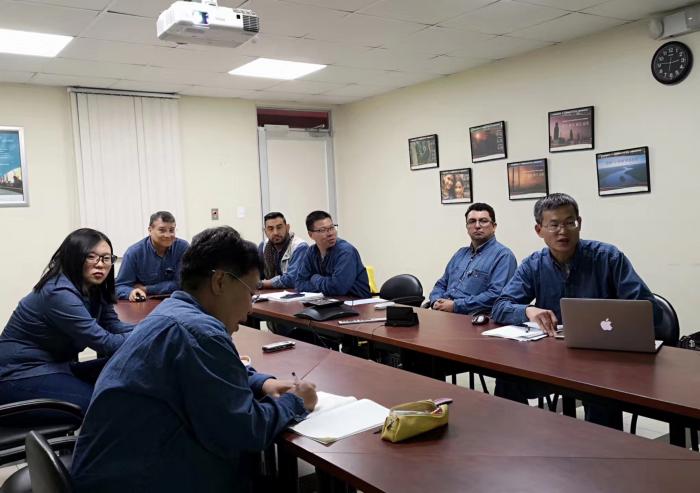油田经理Carlos则对南区油田做了详细介绍。他说,油田142名员工中有10%被安置在EHSS-CA部工作,其中3人负责环境、4人负责健康、3人负责安全、3人负责安保、3人负责社区事务。