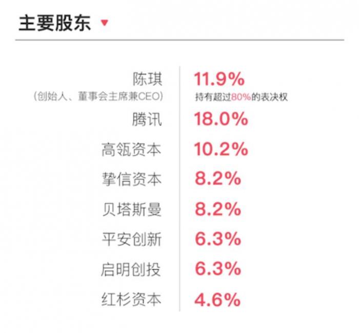 公司主要股东中,腾讯占股比例最大,达18%,其后是CEO陈琪达11.9%,后续依次为高瓴资本10.2%,挚信资本 8.2%,贝塔斯曼 8.2%,平安创新 6.3%,启明创投 6.3%,红杉资本 4.6%。由于蘑菇街采用的是AB股机制,蘑菇街创始人、董事会主席、CEO陈琪的投票权超过80%。