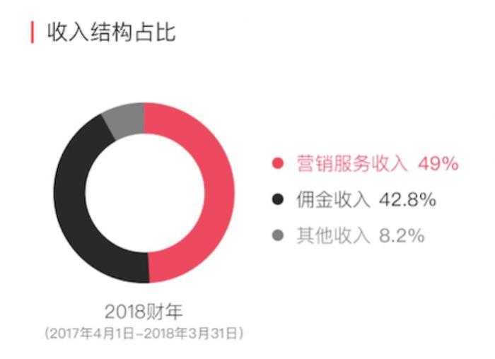在营收构成方面,蘑菇街的收入主要由三大板块构成,分别是营销服务收入、佣金收入和其他收入。招股书显示,2018财年蘑菇街营收为9.73亿元人民币,其中,营销服务收入、佣金收入和其他收入在总收入中占比分别为49.0%、42.8%、8.2%。2019财年上半年(2018年4月1日-2018年9月30日)收入为4.90亿元人民币。