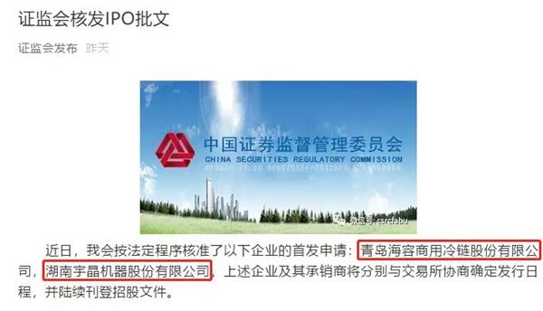 在“爽约”一周后,11月9日,证监会核准了青岛海容商用冷链股份有限公司和湖南宇晶机器股份有限公司2家企业的首发申请,不过与以往不同的是,证监会的公告中并未说明上述企业的融资额度。