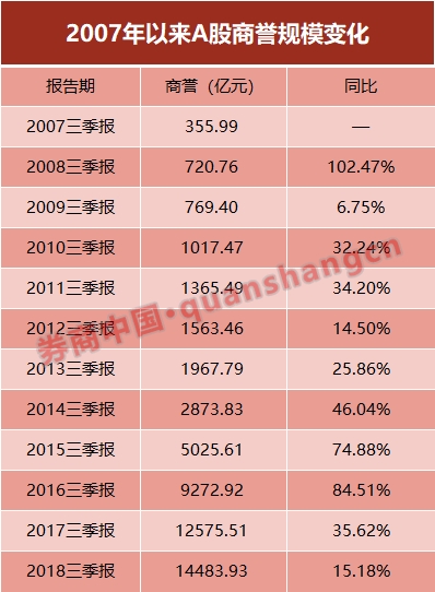 2018年三季度末,A股商誉达到1.45万亿元(14483.93亿元),同比增长15.18%。