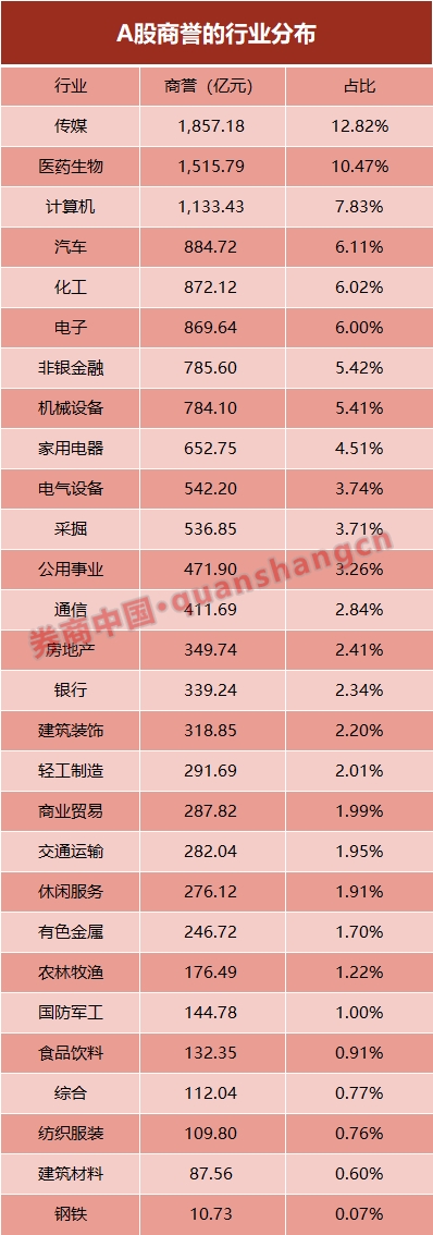 就行业分布来看,拥有最大商誉规模的前三个行业分别是传媒、医药生物、计算机,对应的商誉规模均超千亿元,分别达到1857.18亿元、1515.79亿元和1133.43亿元。