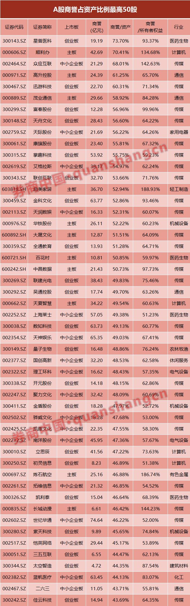 同时,有18家公司的商誉超过所有者权益,4家公司的商誉是所有者权益的2两倍以上。