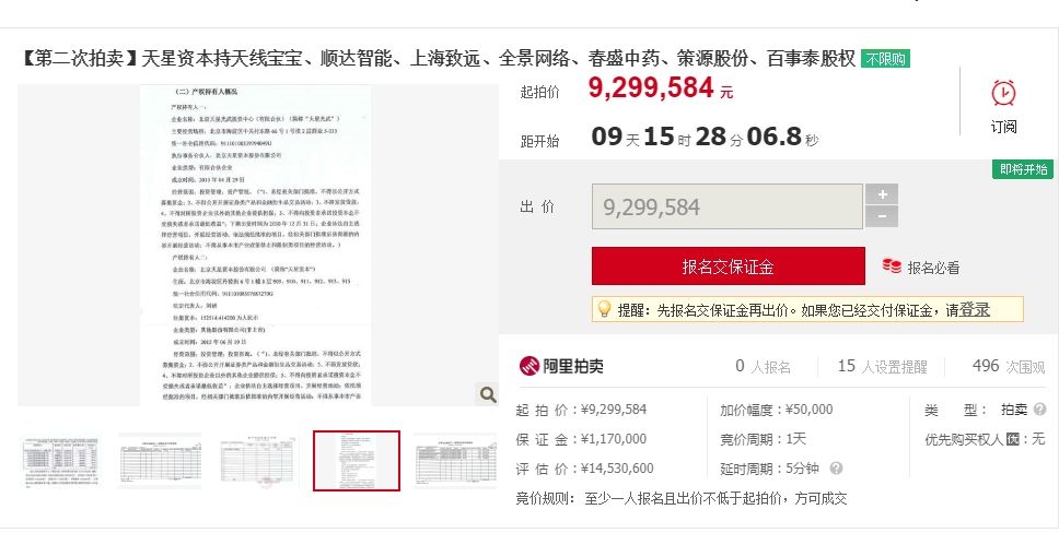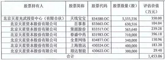 拍卖标的包括北京天星资本股份有限公司持有的顺达智能(30万股)、上海致远(40万股)、全景网络(34万股)、春盛中药(71万股)、策源股份(36万股)、百事泰(63万股)股权,以及天星资本控制的北京天星光武投资中心所持有的天线宝宝(5555556股)股权,资产评估价1453.06万元。