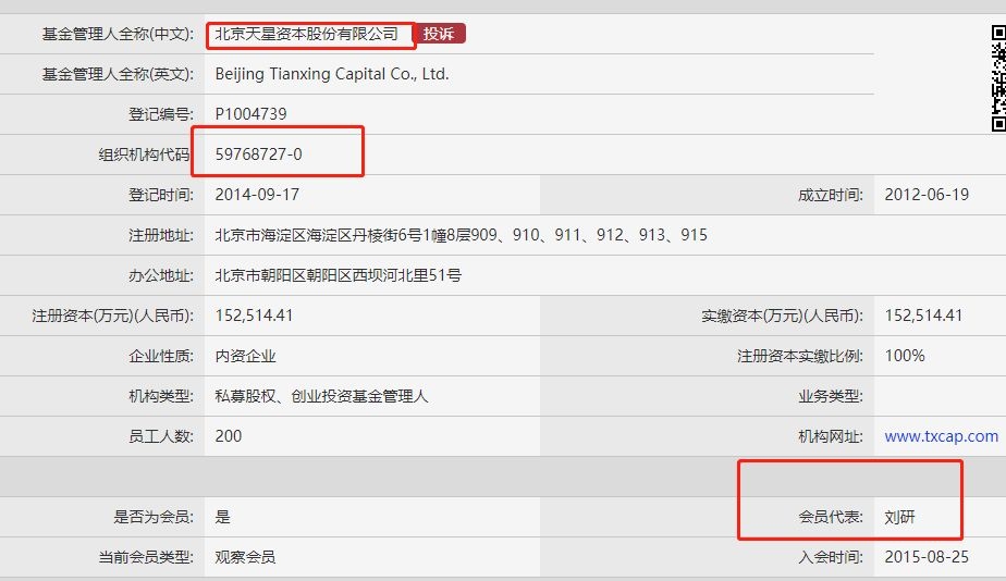 据基金业协会官网显示,北京天星资本股份有限公司的组织机构代码为59768727-0,法定代表人是刘研,与全国执行信息平台的信息相匹配。