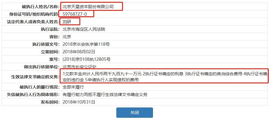 信息显示,天星资本欠款本金共计人民币2900万元,被执行人“全部未履行”,具体情形为 “有履行能力而拒不履行生效法律文书确定义务”,发布时间是2018年10月31日。