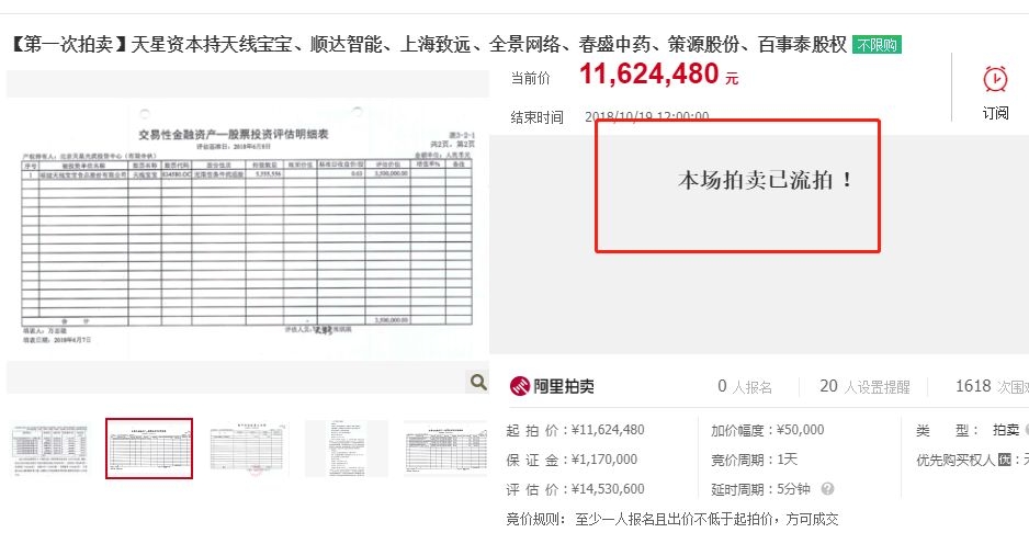 淘宝网司法拍卖平台显示,天星资本所持7家新三板公司股权,将于11月22日12:00开始司法拍卖。