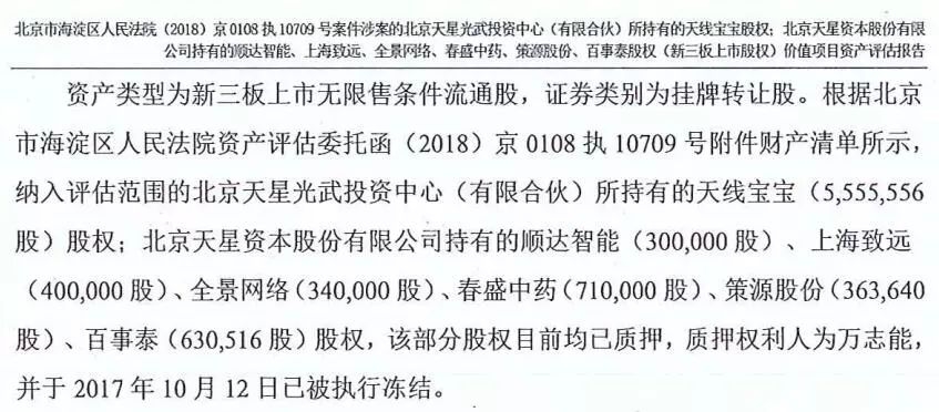 评估报告未披露质押发生的时间,仅显示天星资本、天星光武将前述股权质押给了名为“万志能”的自然人,法院于2017年10月2日执行了冻结。