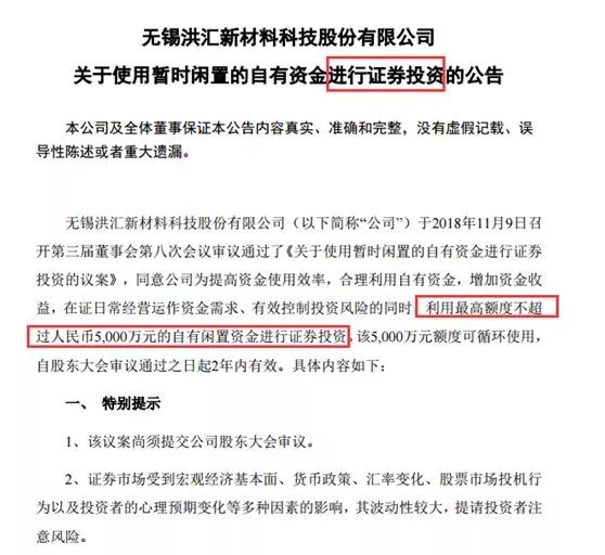 今日晚间,洪汇新材公告称,拟利用自有闲置资金进行证券投资,金额上限为5000万元。