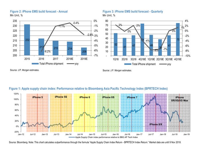 JP Morgan最新研报显示,预计苹果2018年Q4和2019年Q1销量将达到7400万/4800万(先前数值为7600万/5200万),同比下降了8%。而苹果亚太地区供应链指数也已降至4年来新低。