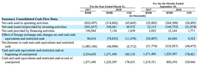 此外,蘑菇街的现金流情况也不乐观。2017财年年初,公司现金及等价物为23.54亿元。2017财年净流出10.8亿元,2018年净流出0.46亿元,2019年4-9月流出3.33亿元。截至9月底,蘑菇街现金及现金等价物8.915亿元,同比减少27%。