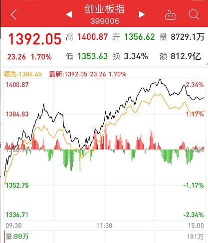 盘面上,创业板指数明显延续近期的强势,早盘低开0.89%后快速拉升,一路上行最终收涨1.7%,收报1392.06点逼近1400点,成交量为87.29亿股,创出该板块设立以来新高。当然,由于市场点位较低,今日成交额812亿元,较高位还有差距。