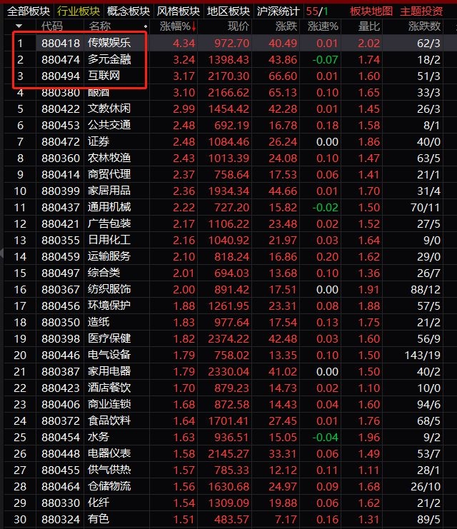 今天两市,传媒娱乐大涨逾4%,互联网涨超3%,领涨两市,这两个板块也是创业板的重要组成部分,传媒板块的华谊兄弟唐德影视等多股涨停,互联网中的乐视网涨停,迅游科技涨近8%,掌趣科技涨逾6%;这些都是创业板的股票。