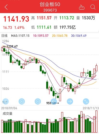 而代表创业板更大个股的指数,创业板50指数涨幅更大,从10月19日触底959.5点反弹至今,到今日收盘1141.93点,从底部起来反弹幅度19.01%。