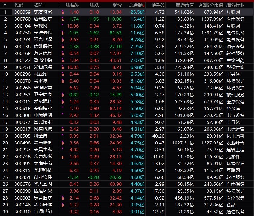 资金大量净流入,加上短期获利资金了结,买卖骤增,创业板成交出天量。